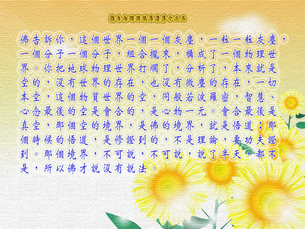佛告訴你,這個世界一個一個灰塵,一粒一粒灰塵,一個分子一個分子,組合攏來,構成了一個物理世界。你把地球物理世界打爛了,分析了,本來就是空的,沒有世界的存在,也沒有微塵的存在,一切本空,這個物質世界的空,同般若波羅密,智慧、心念最後的空是會合的,是心物一元。.jpg