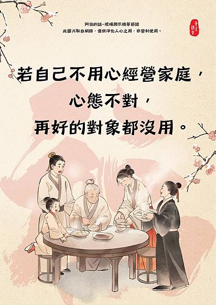 這其實很可惜,人生不過數十年,就算成為一家人,也不該在這精華的十幾年被箝制住,屆時時間到了,對方走了,你剩下什麼?用晚年的時光趕緊唸佛嗎?如果鄰居比她先生早走,難道去地府等先生相聚,再跟先生吵嗎?沒有任何人可以為你的人生負責,只有你能為自己的人生負責。