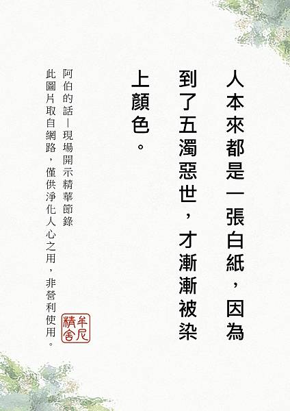 凡夫的大病就是放不下,這才委曲婉轉以種種方便來幫助我們漸漸放下。所以菩薩給我們作一個榜樣、示範,教我們布施,就是教我們要捨,名聞利養、五欲六塵不但要捨,煩惱、憂慮、牽掛也要捨,統統布施掉,生死也要捨;不願意捨,那就搞生死輪迴。」(引用完畢)