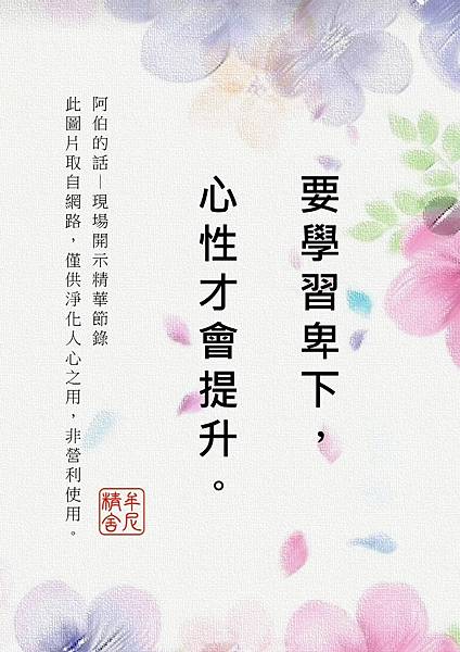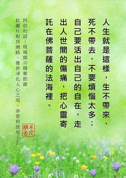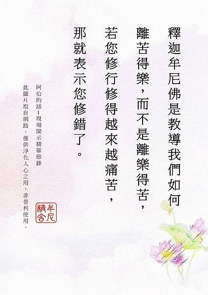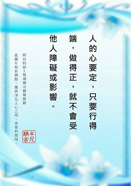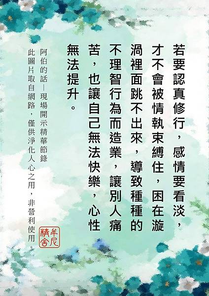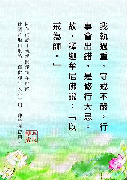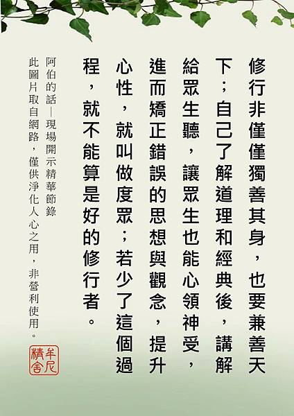 《阿伯的話—現場開示精華節錄》:「每個人原本都是心存正法的。過去沒有智慧而修入外道,在本世修到正法時,自己越精進,外道越會來干擾,因為外道不要讓你修回正法,因此自己要有堅強的意志力,堅持修回正法。」
